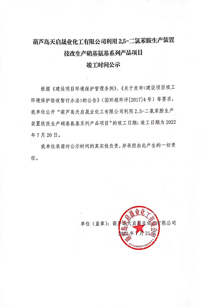 葫蘆島天啟最業化工有限公司利用 2,5-二氯苯胺生產裝置技改生產硝基氨基系列產品項目竣工時間公示