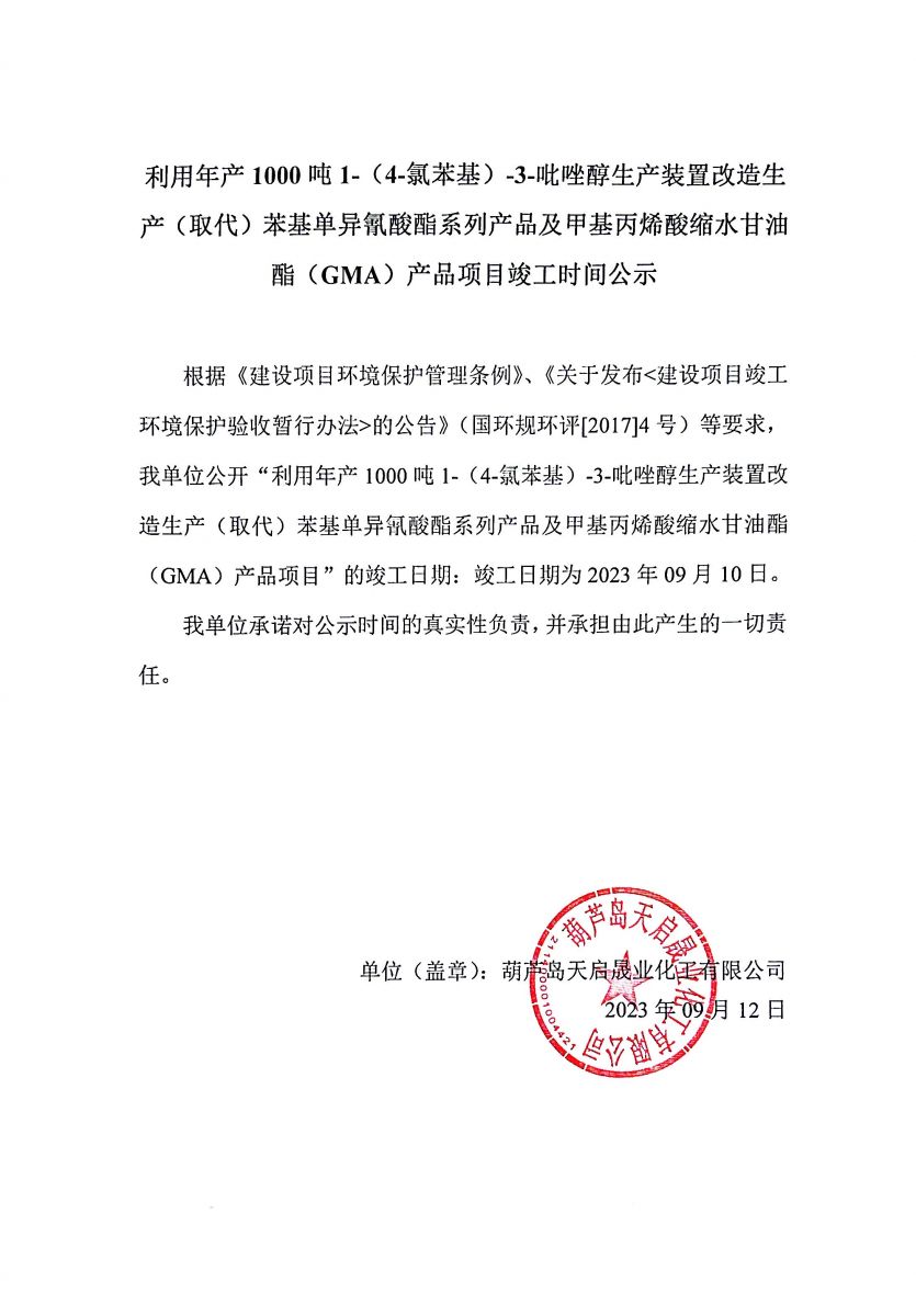 利用年產1000噸1-(4-氯苯基)3-吡唑醇生產裝置改造生 產(取代)苯基單異氰酸酯系列產品及甲基丙烯酸縮水甘油 酯(GMA)產品項目竣工時間公示
